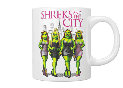 Inject a dose of cheeky charm into your morning brew with our Shreks and the City mug. Featuring a fabulously green and glamorous quartet inspired by everyone’s favourite ogre and the iconic New York fashionistas, this mug is the perfect gift for fans of parody, pop culture, or just a good laugh. Made from durable ceramic and printed in vibrant colours, it’s ideal for tea, coffee, or even a cosmopolitan (we won’t judge). Start your day with sass, satire, and a splash of swamp glamour.